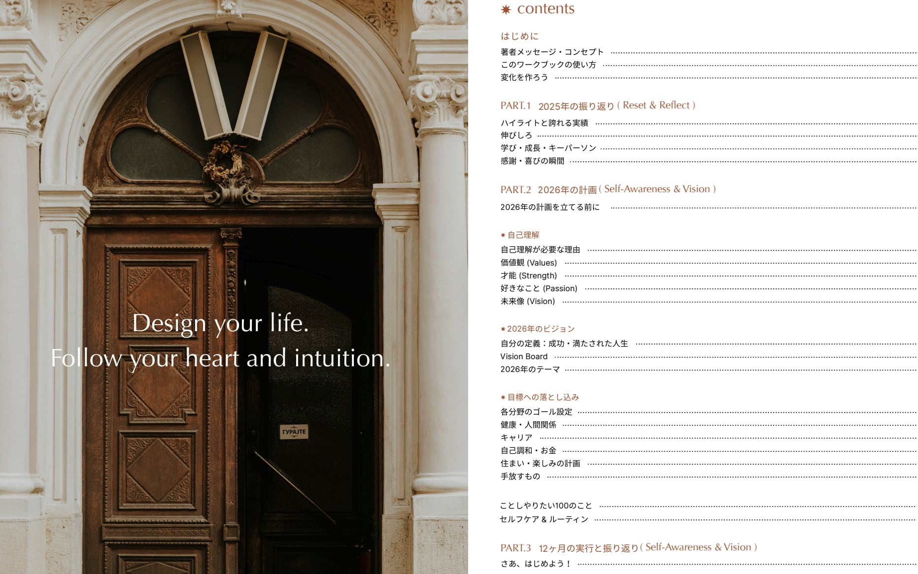 自分を再発見すること、自分を好きになること、そして新しい1年をよりあなたらしく、そして、最高の時間にするための目標設定など、あなたを深める質問とワークが満載の「人生リデザイン・ワークブック」。