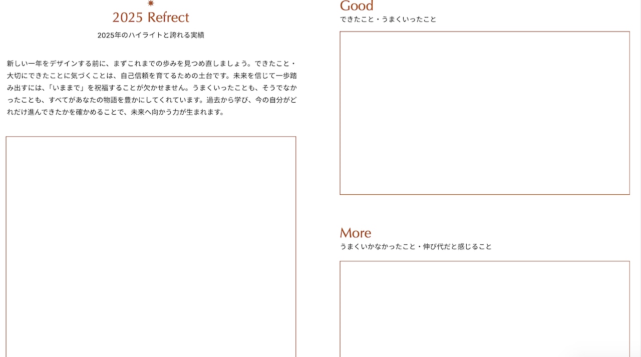 新しい年を始める前に、まず過去の一年を振り返るセクションがあります。「何もない1年だった」なんて思っても、実はいろんな経験を経てきているもの。歩みを無視せずに、丁寧に振り返ることで、自分を受容することにつながります。