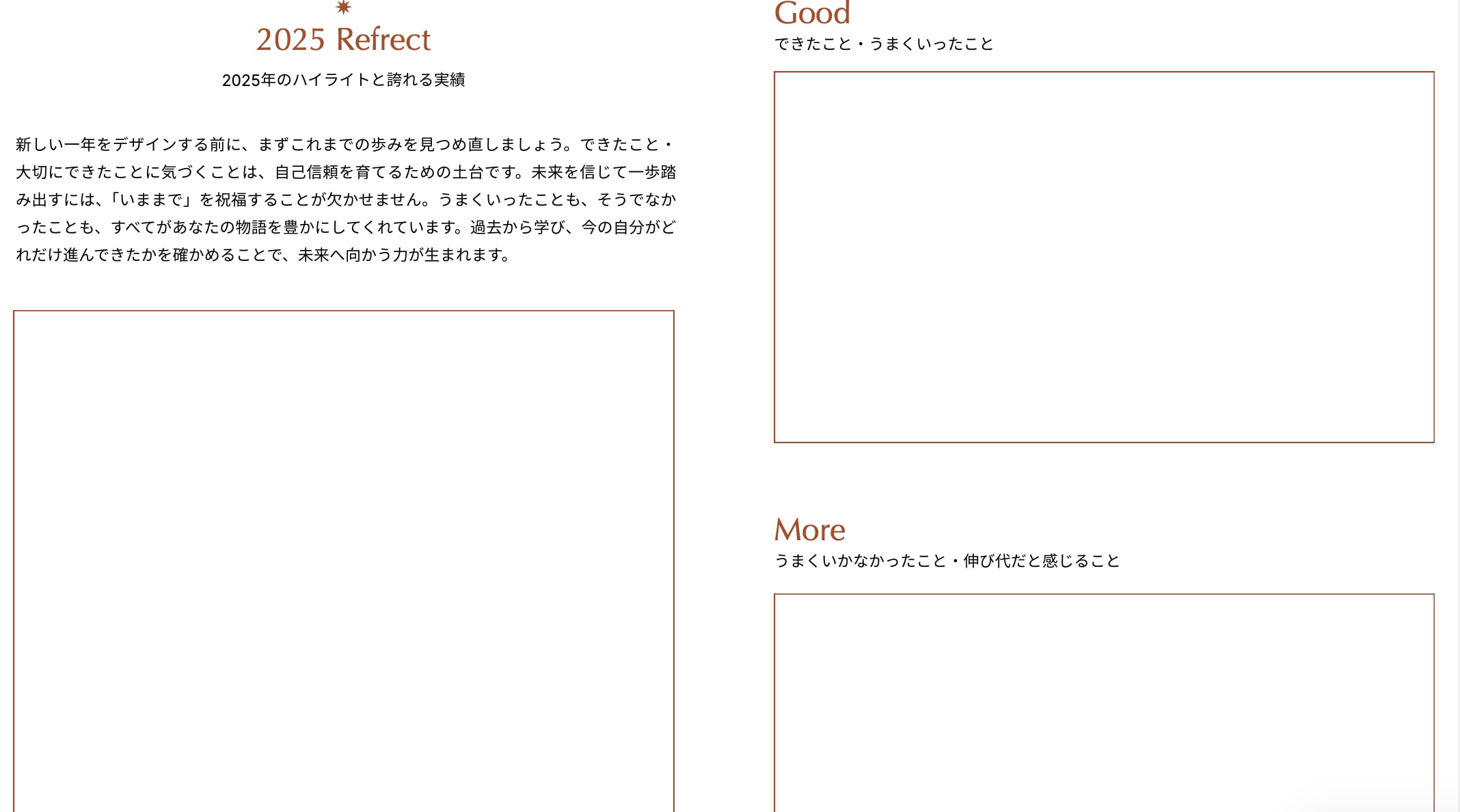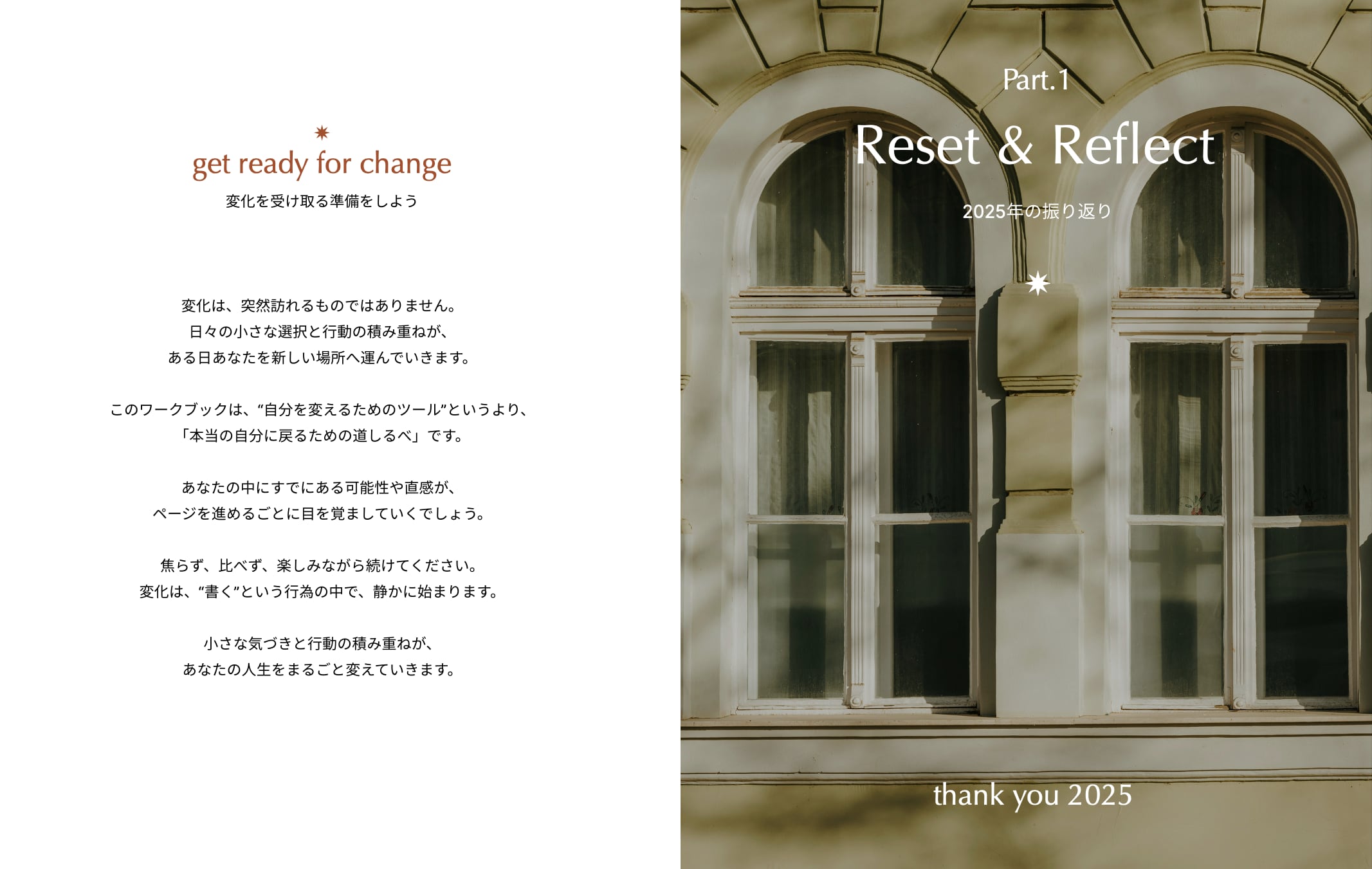 新しい年を始める前に、まず過去の一年を振り返るセクションがあります。「何もない1年だった」なんて思っても、実はいろんな経験を経てきているもの。歩みを無視せずに、丁寧に振り返ることで、自分を受容することにつながります。
